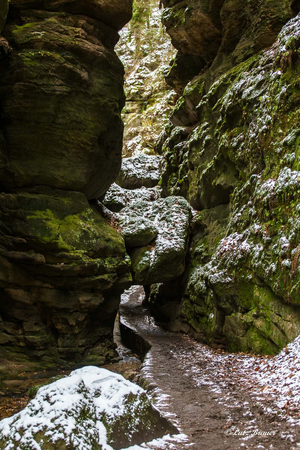 Das Uttewalder Felsentor hat sich seit dem Entstehen von Friedrichs Gemälde wohl kaum verändert, diese sackgassenartige finstere Felsenkluft und der unerwartete Durchgang versetzen unsereinen immer wieder in Erstaunen.