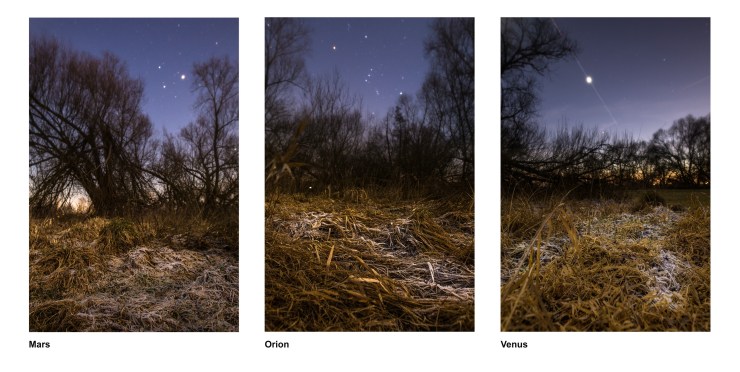 Mit Mars – linkes Bild und Venus – rechtes Bild sind die beiden erdnächsten und trotzdem Millionen von Kilometern entfernten Planeten über dem reifstarren Gras zu sehen, mit Orion gleitet der Blick vom Allernächsten, dem Gras, in dem man gerade kniet, auf die Lichtjahre entfernten Sterne. So klein und zerbrechlich ist das, worauf wir leben und so dünn ist die Schale, die uns vor der Unendlichkeit da draußen schützt. Das wäre nach dem Abschnitt „Glücksmoment“ die zweite Geschichte, die sich aus der erlebten Situation ergeben würde.