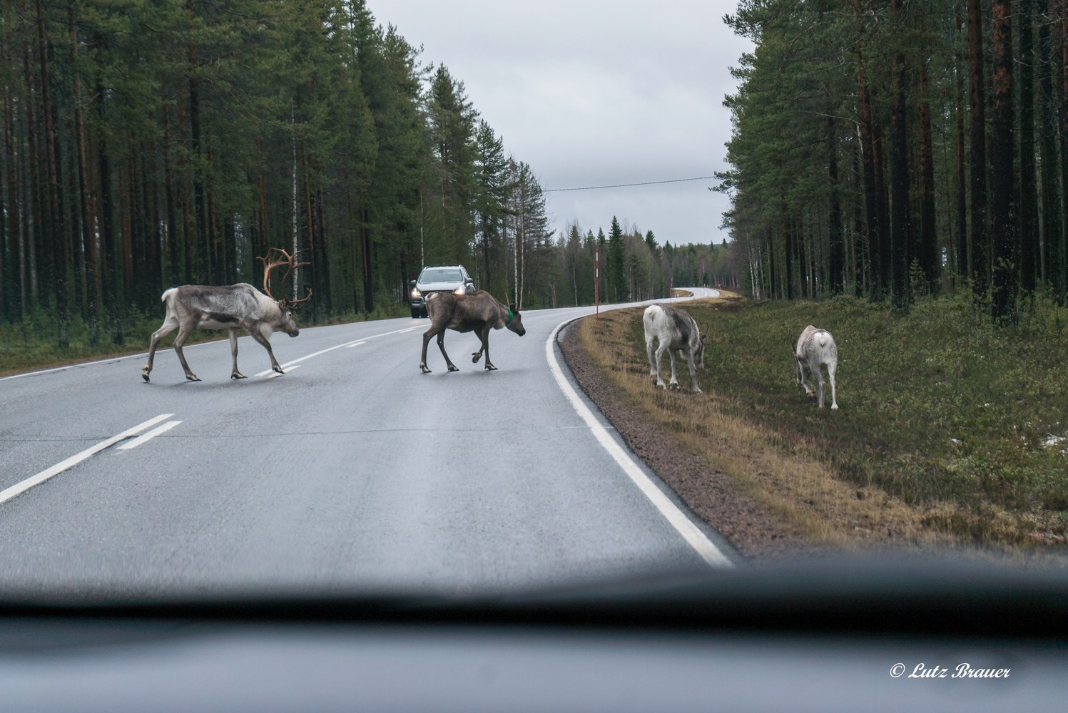 Die Rentiere waren zahm, hatten aber keinerlei Scheu, ganz spontan mal die Straße zu queren. Für die Finnen alltäglich, für uns jedes Mal ein Ereignis.