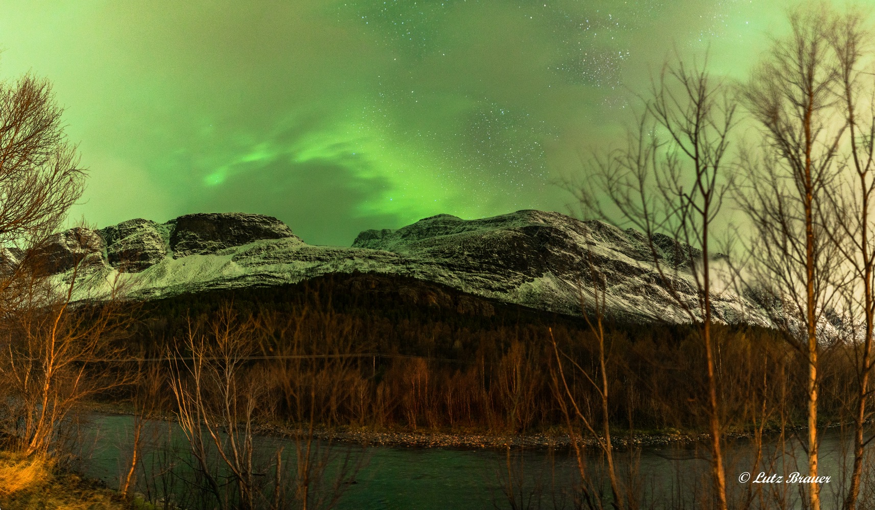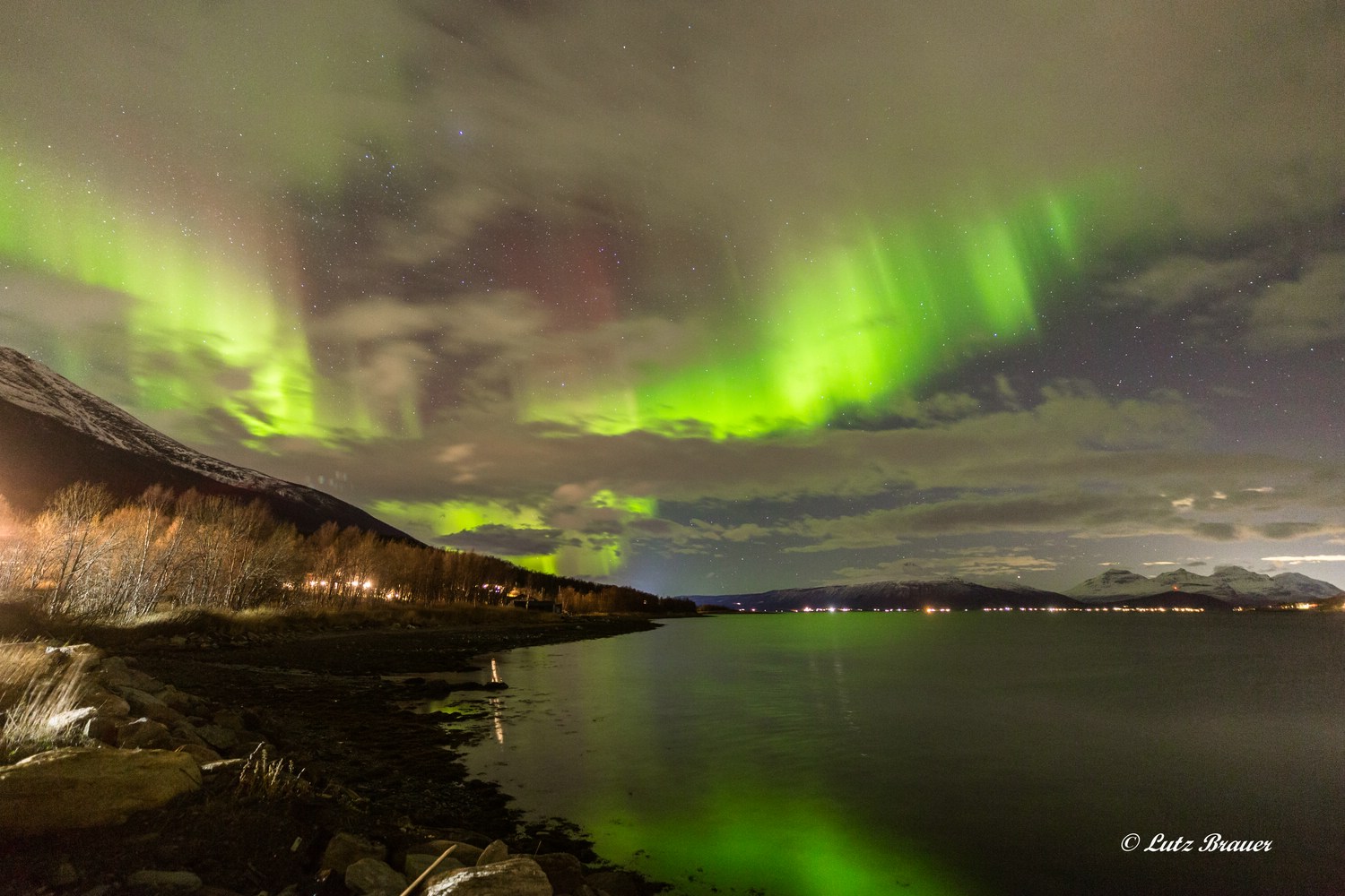 Als dieser Streifen in seiner Helligkeit und Bewegung nachlässt, wechseln wir nur noch kurz hinüber zum Südufer des Balsfjords, dort haben wir einen kleinen Hafen als Standort ausgemacht, Berge ringsum, Spiegelungen im stillen Wasser, das sind schöne Motive.