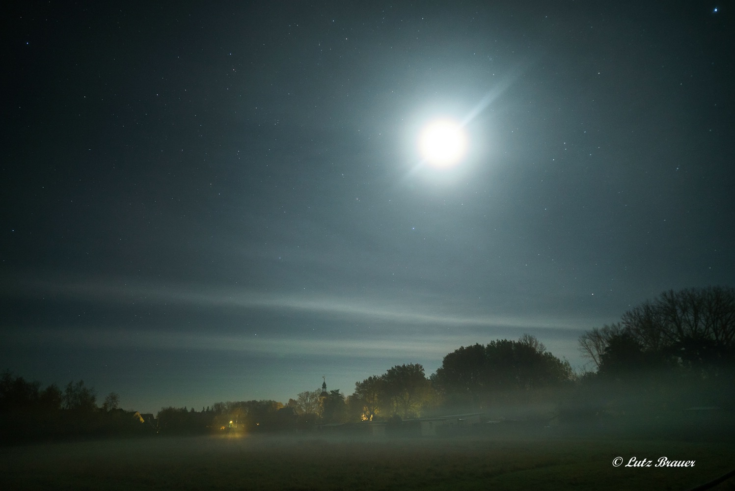 Binnen weniger Minuten steht der uHu auf den Wiesen am Flüsschen. Nebelschwaden ringsumher, langgezogene dünne Wolken am Himmel, Sterne, Mond und nur wenig Lichter ringsum. Die Welt schläft.